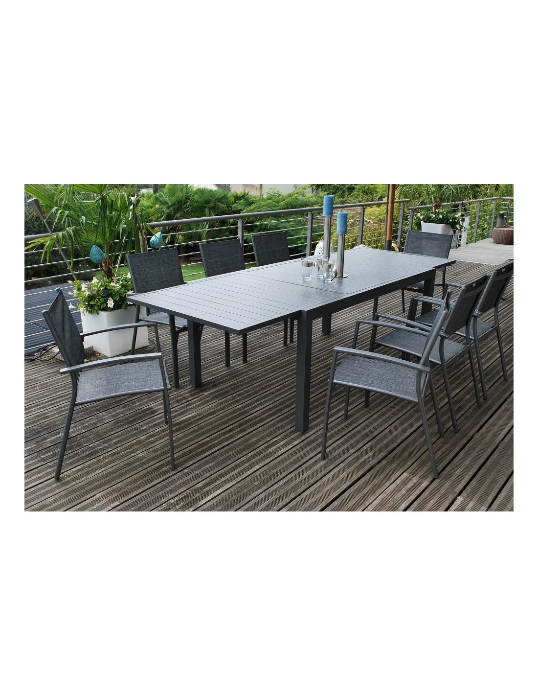 Une table tout aluminium, sans entretien, avec un plateau effet bois qui pourra recevoir jusqu’à 12 personnes.